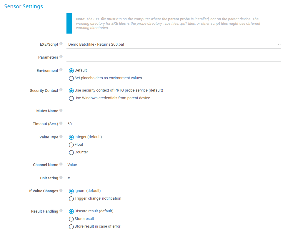 The EXE/Script sensor runs an executable file (.exe) or a script (batch file, VBScript, PowerShell) on the probe system. This option is available as part of the PRTG API.