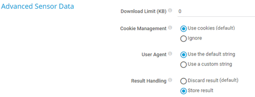 Store result: Store the last result of the web page in the \Logs\sensors subfolder of the PRTG data directory on the probe system. The file names areResult of Sensor [ID]-1.txt and Result of Sensor [ID].Data.txt. This setting is for debugging purposes, especially in combination with content checks. PRTG overwrites the files with each scanning interval.
