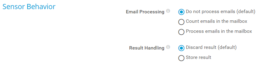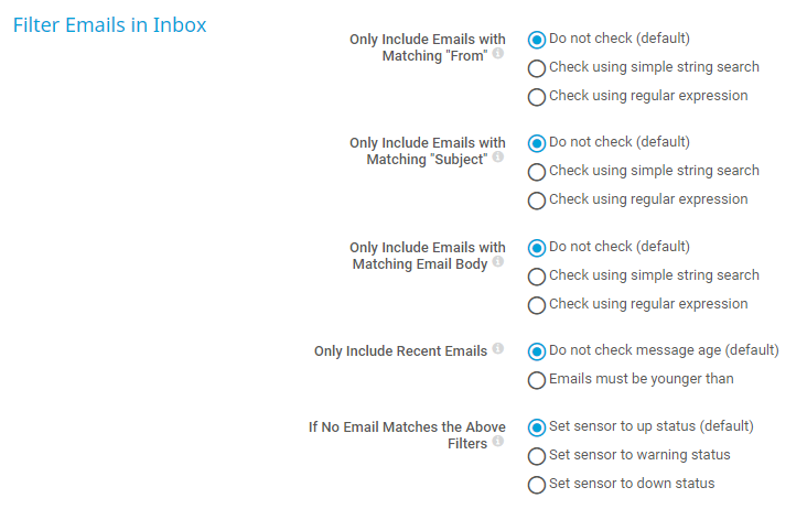• Set sensor to up status (default): Show the Up status if the sensor does not find any email in the mailbox that matches the filters.