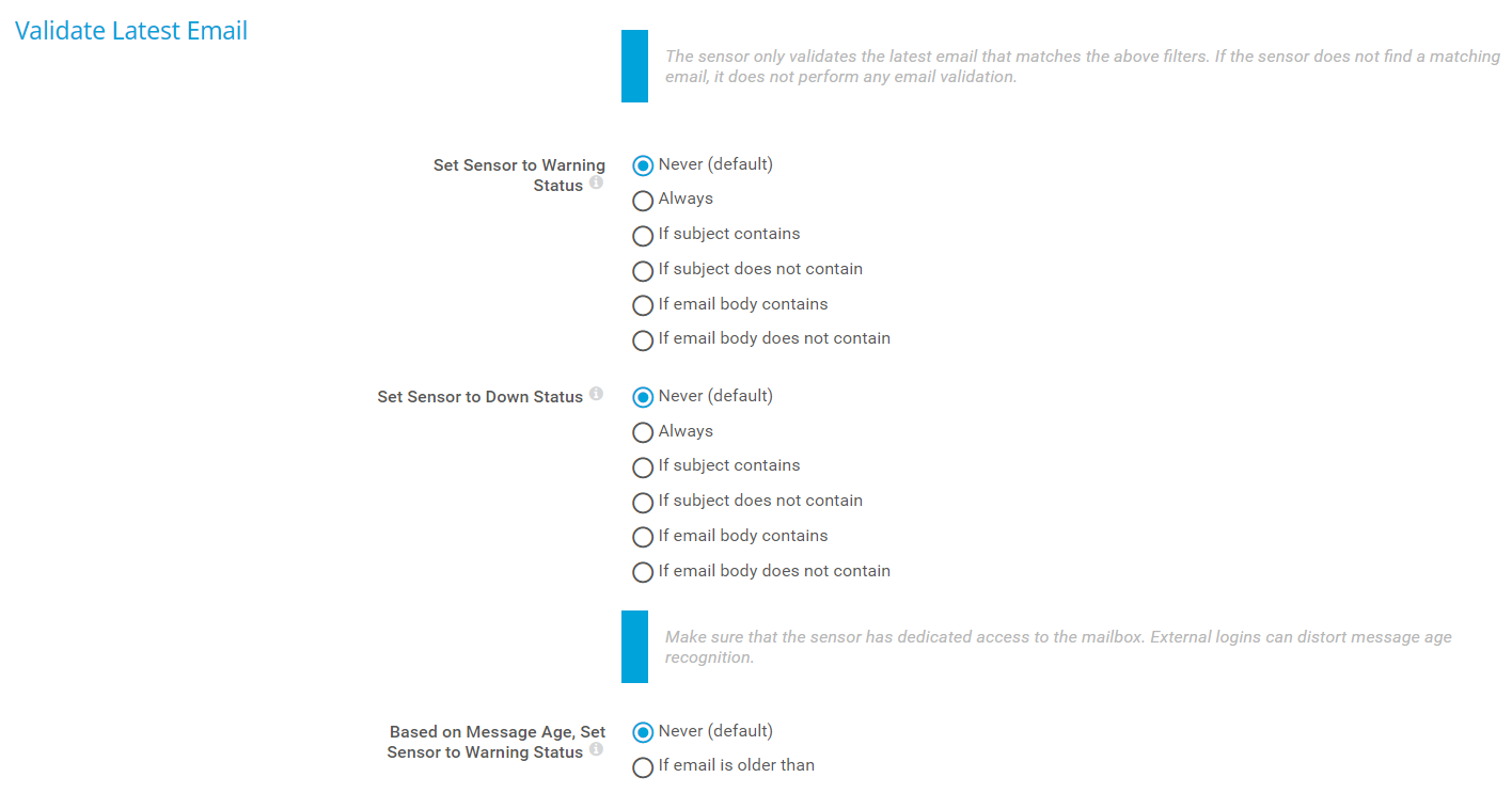 i_round_redThe sensor only validates the latest email that matches the above filters. If the sensor does not find a matching email, it does not perform any email validation.