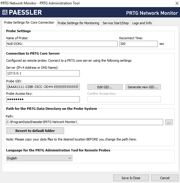 Choose the language for the PRTG Administration Tool on the remote probe. The default is English.