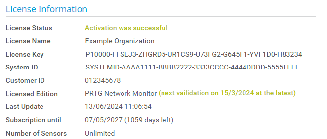 Shows the owner of the license that you use for this PRTG installation, for example ExampleOrganization.