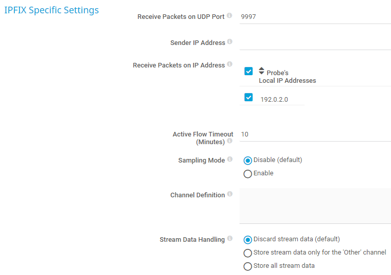 This sensor requires that the IPFIX export is enabled on the target system. The target system must send the flow data stream to the IP address of the probe system.