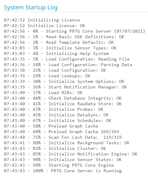 This section shows the log information that was created during the last startup of the PRTG core server.